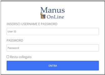 Per entrare nell’area riservata alla catalogazione in Manus Online (MOL) bisogna innanzitutto essere forniti di username e password, che vengono creati e poi assegnati ai catalogatori dall’Area manoscritti dell’ICCU.