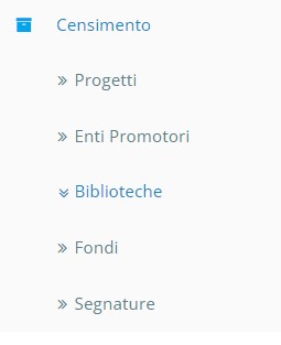 Le attività di creazione dei fondi e delle segnature sono comprese nel menù (a sinistra della schermata di apertura del back end) sotto la voce: Censimento; invece, la creazione delle schede descrittive è possibile solo accedendo alla voce: Catalogazione: