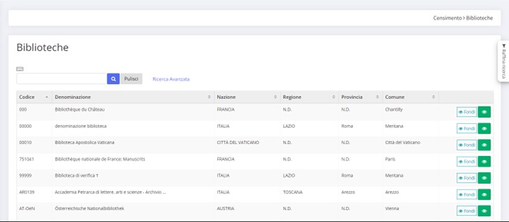 Si selezionerà l’opzione ''Biblioteche'', che farà comparire un elenco delle biblioteche presenti in Manus Online: | Si selezionerà l’opzione '''''Biblioteche''''', che farà comparire un elenco delle biblioteche presenti in Manus Online: | ||