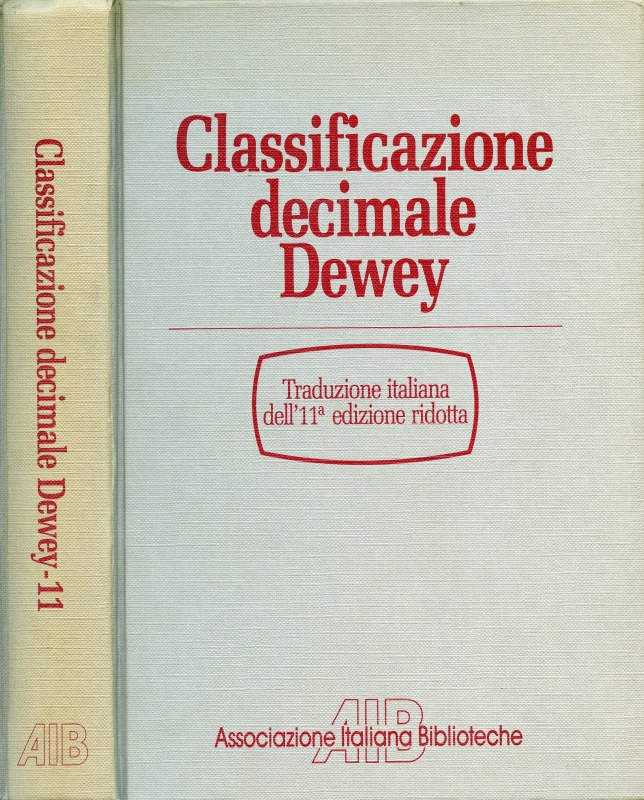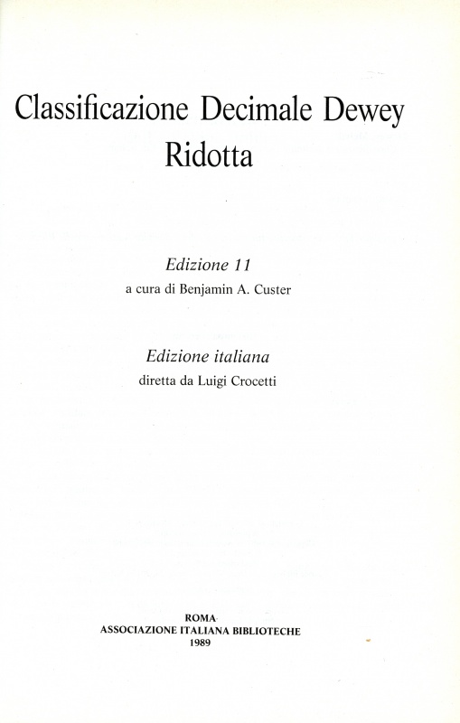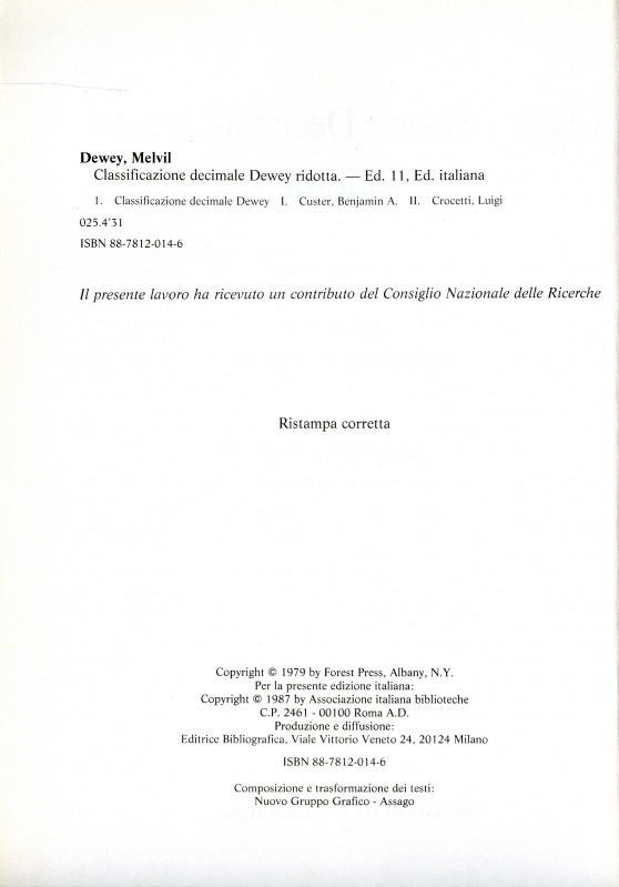 Dewey – Classificazione decimale Dewey ridotta (1989)REICAT 1.7.1. Variazioni tra gruppi o serie di esemplari – 1.7.1.4. Classificazione decimale Dewey ridotta. – Ed. 11 / a cura di Benjamin A. Custer, ed. italiana / diretta da Luigi Crocetti, ristampa corretta. – Roma : Associazione italiana biblioteche, 1989 (ristampa con correzioni, che è opportuno descrivere autonomamente) OPAC Indice SBN: http://id.sbn.it/bid/BVE0018663 Puntano qui |