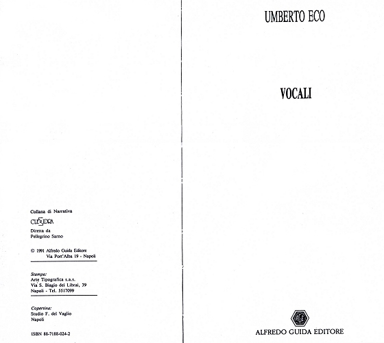 Eco – Vocali (1991)Eco, Umberto Vocali / Umberto Eco. Soluzioni felici / Paolo Domenico Malvinni. – Napoli : Guida, 1991. – 43, 83 p. ; 20 cm. – (Clessidra). Pubblicazione bifronte. – ISBN 88-7188-024-2 Titolo uniforme: Vocali i.p. Eco, Umberto