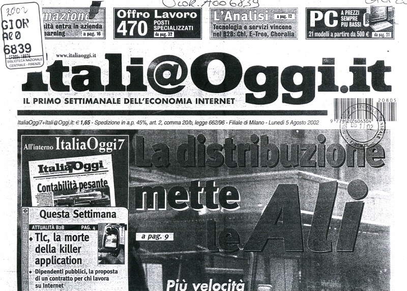 Itali@oggi.itItalia@oggi.it : il primo settimanale dell’economia internet. – 23 apr. 2000-anno 5, n. 42 (16 ott. 2004). – Milano : Italiaoggi : Erinne, 2000-2004. – 5 volumi. : ill. ; 37 cm. – Supplemento a: Italia oggi[1] t.u. Itali@oggi.it