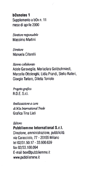 Box. Notes - Periodico (2000-)Box. Notes : osservatorio sull’illuminazione decorativa e tecnica = decorative and technical lighting overview. - 1-. - Milano : Publiemme international, 2000-. - Volumi : ill. ; 24 cm. - Periodicità non determinata. BNI: 2005-807S[1] t.u. Box. Notes <periodico>