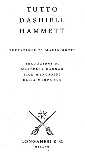 Tutto Dashiell Hammett (1962)Hammett, Dashiell Tutto Dashiell Hammett / prefazione di Mario Monti ; traduzioni di Marcella Hannau, Bice Mengarini, Elisa Morpurgo. - Milano : Longanesi, 1962. - 1293 p. ; 18 cm. - (I marmi ; 31). - Traduzione di: The maltese falcon ; The thin man ; Red harvest ; The dain curse ; The glass key. In custodia. BNI: 629351[1] t.coll.u. [Opere. Romanzi] (in italiano)
