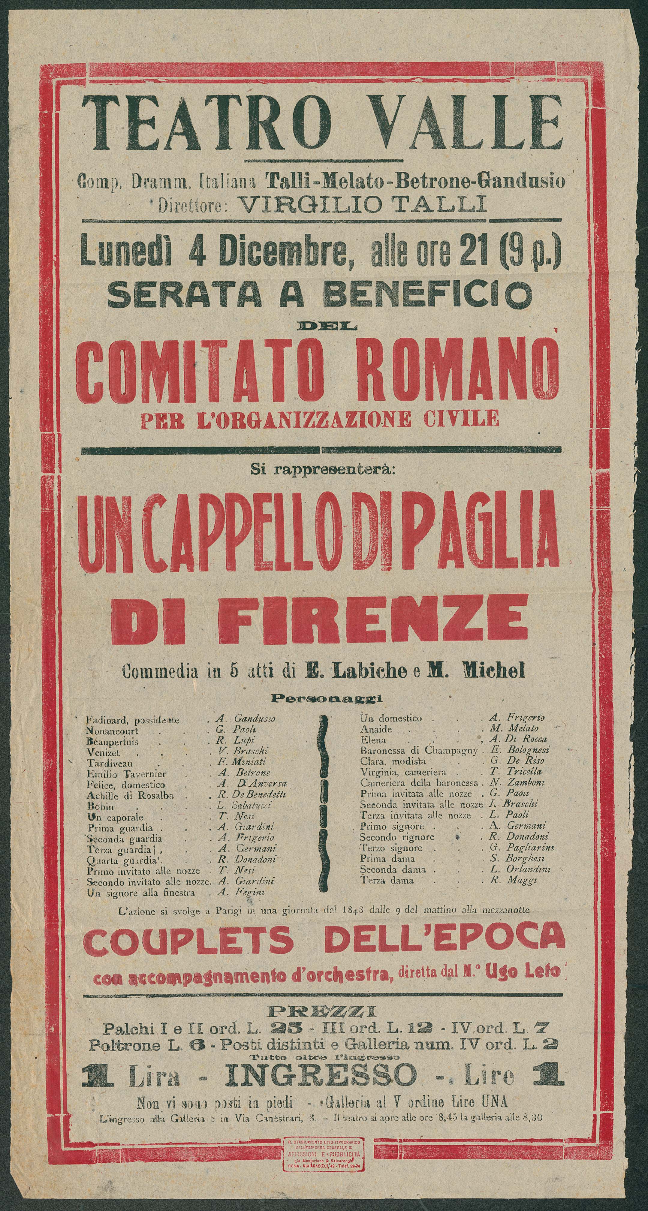 | Titolo | Lunedì 4 dicembre, alle ore 21 (9 p.) serata a beneficio del Comitato romano per l'organizzazione civile, si rappresenterà: Un cappello di paglia di Firenze, commedia i 5 atti di E. Labiche e M. Michel |