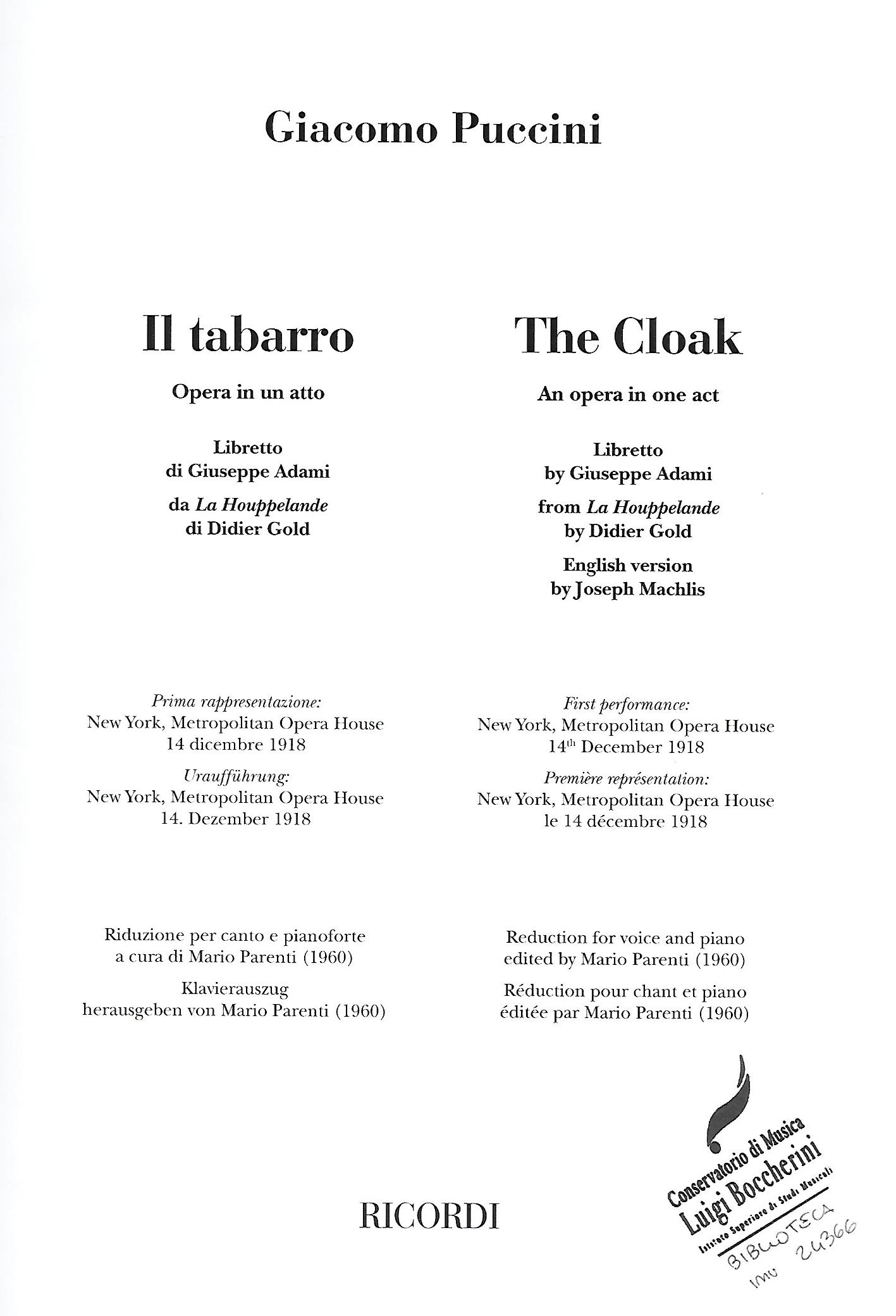 Giacomo Puccini: Il tabarro, frontespizio