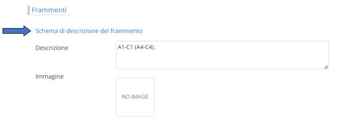 - l’area permette di descrivere più nel dettaglio i frammenti la cui presenza è stata segnalata nella sezione Consistenza. Frammenti in situ. Nel campo libero Descrizione è possibile fornire tutte le informazioni che il catalogatore può ritenere utili per l’utente (data, supporto, dimensioni, tipo di scrittura, testo) fino all’integrale trascrizione del frammento. Può tuttavia limitarsi a indicare, secondo una semplice formula, la parte della carta (o del foglio) da cui il frammento proviene, avvalendosi dello schema cliccabile sopra Schema di descrizione del frammento. Ad esempio, la semplice formula A1-C1 (A4-C4), come nell’immagine di seguito riportata, indica che il frammento conserva l’intero margine esterno della carta (che sul recto corrisponderà a A1-C1, sul verso ad A4-C4).
