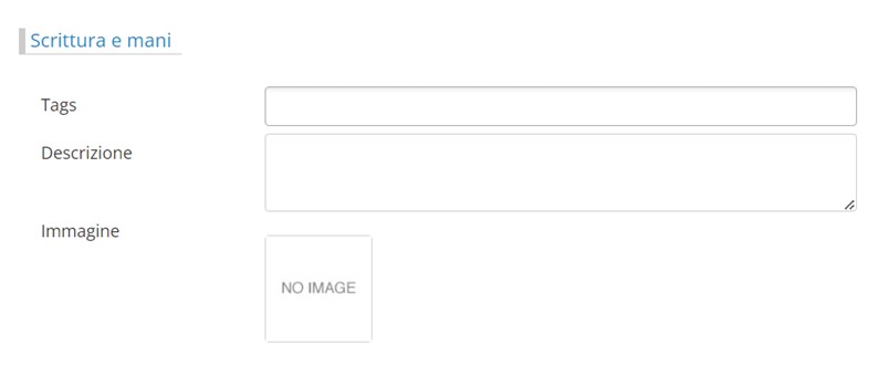 Il campo Tags consente di formulare una definizione della scrittura, tenendo conto di quelle già inserite nella base dati. Posizionando il cursore sulla stringa e digitando la definizione scelta, compariranno tutte le opzioni già esistenti: