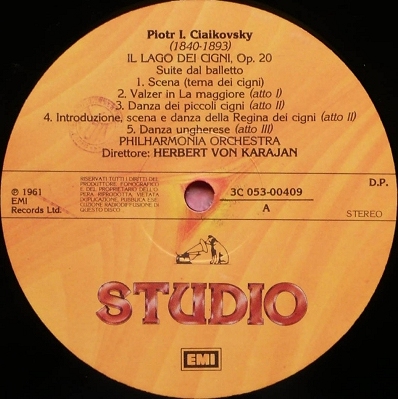 Čajkovskij - Il lago dei cigni e La bella addormentataČajkovskij, Pëtr Ilʹič Il lago dei cigni, op. 20 : suite dal balletto ; La bella addormentata, op. 66 : suite dal balletto / Piotr I. Ciaikovsky (1840-1893) ; Philharmonia Orchestra ; direttore Herbert von Karajan. - [Italia] : EMI, 1961. - 2 dischi sonori : 33 1/3 rpm, stereo ; 30 cm. - Numero editoriale: 3C 053-00409 t.u. Il lago dei cigni : suite, op. 20