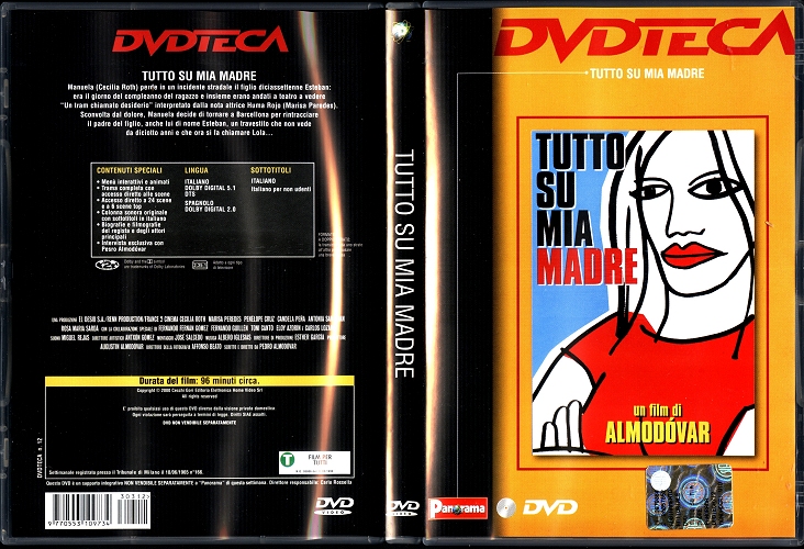 Almodóvar - Tutto su mia madre (2003)Tutto su mia madre / un film di Almodóvar. - [Milano : Panorama distributore, 2003]. - 1 DVD : sonoro, color. ; in contenitore, 19 cm. - (Dvdteca ; 12). - Codice area: 2: formato video: 2.35:1, adatto ad ogni tipo di televisore; diversi formati audio; formato a doppio strato. Interpreti principali: Cecilia Roth, Penelope Cruz, Candela Pena. Contenuti speciali: colonna sonora originale, intervista con Pedro Almodovar, biografie e filmografie. Lingue: italiano, spagnolo; sottotitoli in italiano per non udenti. Riproduzione del film del 1999. Distribuito con Panorama. Non vendibile separatamente[1] t.u. Todo sobre mi madre <film ; 1999>