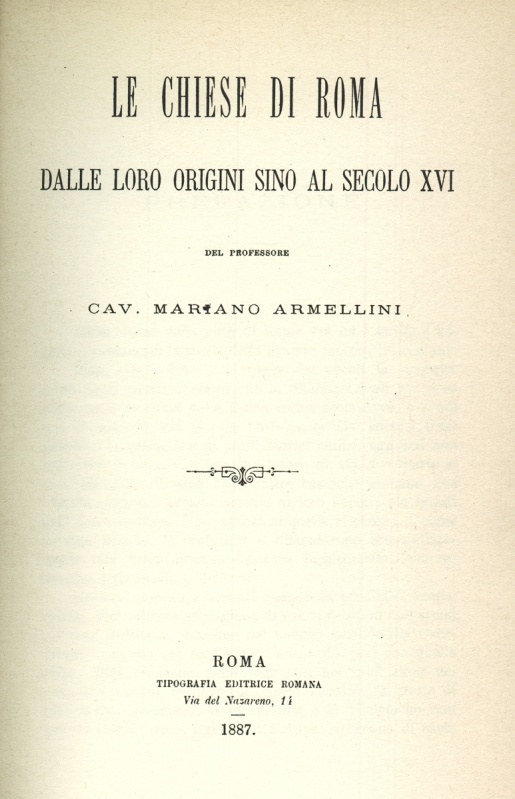 Le chiese di Roma : dalle loro origini sino al secolo XVI / del professore cav. Mariano Armellini. - [Roma? : s.n., 19--]. – III, 805 p. ; 21 cm. – Ristampa anastatica dell’edizione: Roma : Tipografia editrice romana, 1891, realizzata dall'originale del 1887[1]