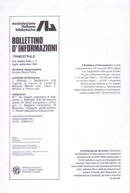 Associazione italiana biblioteche - Bollettino d’informazioniBollettino d’informazioni / Associazione italiana biblioteche. – N. s., anno 1, n. 1 (gen.-feb. 1961)-anno 31, n. 3 (lug.-set. 1991). – Roma : Associazione italiana biblioteche, 1961-1991. – 31 volumi. – Continuazione di: Notizie A.I.B. Continuato da: Bollettino AIB. Bimestrale, dal 1971 trimestrale. – ISSN 0004-5934 t.u. Bollettino d’informazioni <Associazione italiana biblioteche ; 1961 ; Roma>