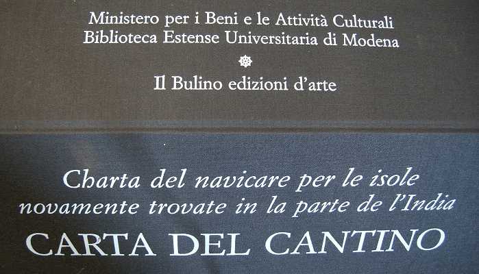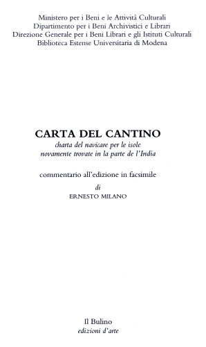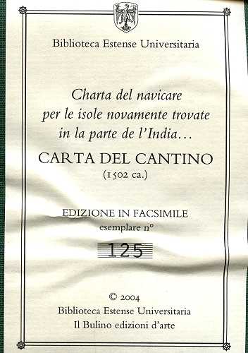 Carta del Cantino (2004)Cantino, Alberto Carta del Cantino (1502 ca.) : Charta del navicare per le isole novamente trovate in la parte de l’India... - Ed. in facsimile. - [Modena] : Biblioteca Estense universitaria : Il bulino, 2004. - 1 carta : color. ; 105x225 cm + 1 volume (125 p. : ill. ; 24 cm). - Riproduzione della carta C.G.A.2, conservata presso la Biblioteca Estense universitaria di Modena. Contiene: Carta del Cantino : Charta del navicare per le isole novamente trovate in la parte de l'India / commentario all'edizione in facsimile di Ernesto Milano. Ed. di 750 esemplari numerati. In cofanetto[1] t.u. Carta del Cantino