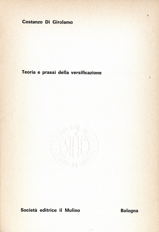 Di Girolamo – Teoria e prassi della versificazione (1976)Di Girolamo, Costanzo Teoria e prassi della versificazione / Costanzo di Girolamo. – Bologna : Il mulino, [1976]. – 230 p. ; 21 cm. – (La nuova scienza. Serie di linguistica e di critica letteraria)[1] t.u. Teoria e prassi della versificazione