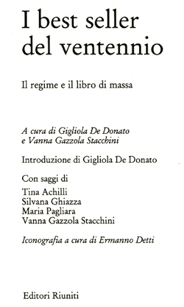 I best seller del ventennio (1991)I best seller del ventennio : il regime e il libro di massa / a cura di Gigliola De Donato e Vanna Gazzola Stacchini ; introduzione di Gigliola De Donato ; con saggi di Tina Achilli, Silvana Ghiazza, Maria Pagliara, Vanna Gazzola Stacchini ; iconografia a cura di Ermanno Detti. - Roma : Editori riuniti, 1991. - LXIII, 729 p., [16] carte di tav. : ill. ; 24 cm. - (Accademia). - In custodia. - ISBN: 88-359-3502-4[1] t.u. I best seller del ventennio