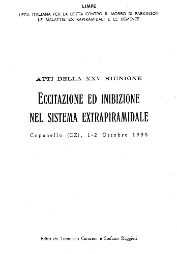 LIMPE - Eccitazione ed inibizione nel sistema extrapiramidale (1999)LIMPE Eccitazione ed inibizione nel sistema extrapiramidale : atti della XXV Riunione : Copanello (CZ), 1-2 ottobre 1998 / LIMPE, Lega italiana per la lotta contro il morbo di Parkinson, le malattie extrapiramidali e le demenze ; edito da Tommaso Caraceni e Stefano Ruggieri. – Roma : [s.n.], 1999. – 412 p. ; 24 cm t.u. Eccitazione ed inibizione nel sistema extrapiramidale