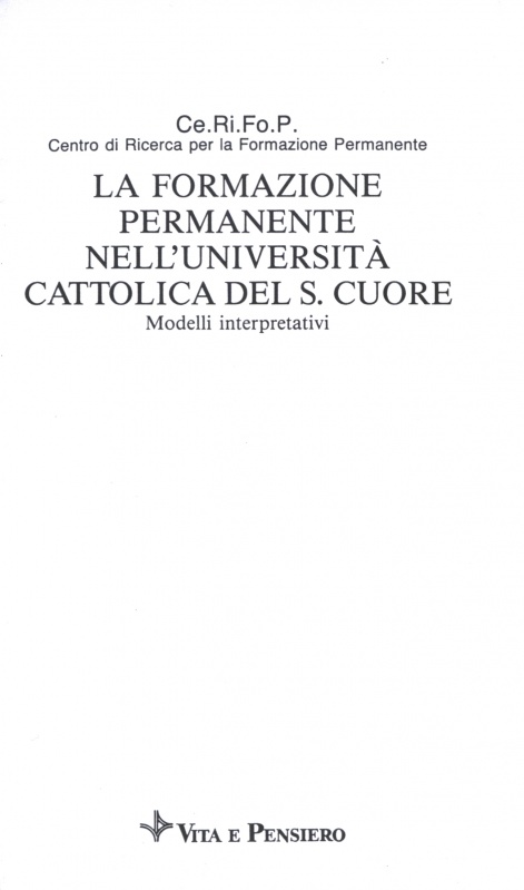 La formazione permanente (1992)Centro di ricerca per la formazione permanente La formazione permanente nell'Università Cattolica del S. Cuore : modelli interpretativi / Ce.Ri.Fo.P., Centro di ricerca per la formazione permanente. – Milano : Vita e pensiero, [1992]. – IX, 166 p. ; 19 cm. – (Uomini e tempi ; 25). – ISBN 88-343-4873-7[1] t.u. La formazione permanente nell’Università Cattolica del S. Cuore