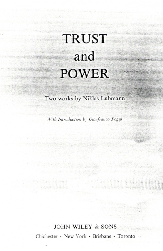 Luhmann – Trust and Power (1979)Luhmann, Niklas Trust and Power : two works by Niklas Luhmann / with introduction by Gianfranco Poggi. – Chichester [etc.] : Wiley, 1979. – xix, 208 p. ; 24 cm. – Traduzione di Howard Davis, John Raffan e Kathryn Rooney. – ISBN 0-471-99758-7[1] t.u. Vertrauen