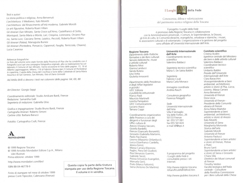 San Miniato, il Valdarno Inferiore e la Valdera (1999)San Miniato, il Valdarno inferiore e la Valdera / a cura di Roberta Roani Villani ; testi di Anna Benvenuti ... (et al.). – Milano : Mondadori ; [Firenze] : Regione Toscana, 1999. – 167 p. : ill. ; 22 cm. – (I luoghi della fede). – ISBN 88-04-46778-9[1] t.u. San Miniato, il Valdarno inferiore e la Valdera