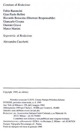 Synesis : periodico dell’Associazione italiana centri culturali. - Anno 1, [n. 1] (apr. 1984)-anno 6 (1989), n. 4 ; nuova serie, anno 7 (1990), n. 1-anno 9 (1992), n. 2. - Milano : AIC, 1984-1992. - 9 volumi : ill. ; 21 cm. - Trimestrale. Il complemento del titolo varia. Dal 1993 assorbito da: Il nuovo areopago[1]